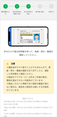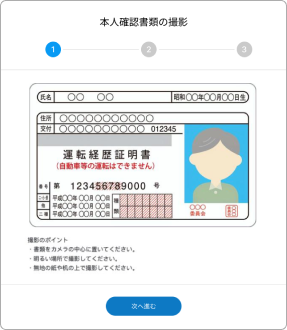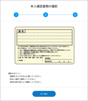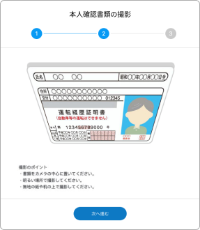 本人確認書類を表面→斜め→裏面と順番に撮影します。 撮影時の注意を読んだら「次に進む」ボタンをタップしてください。